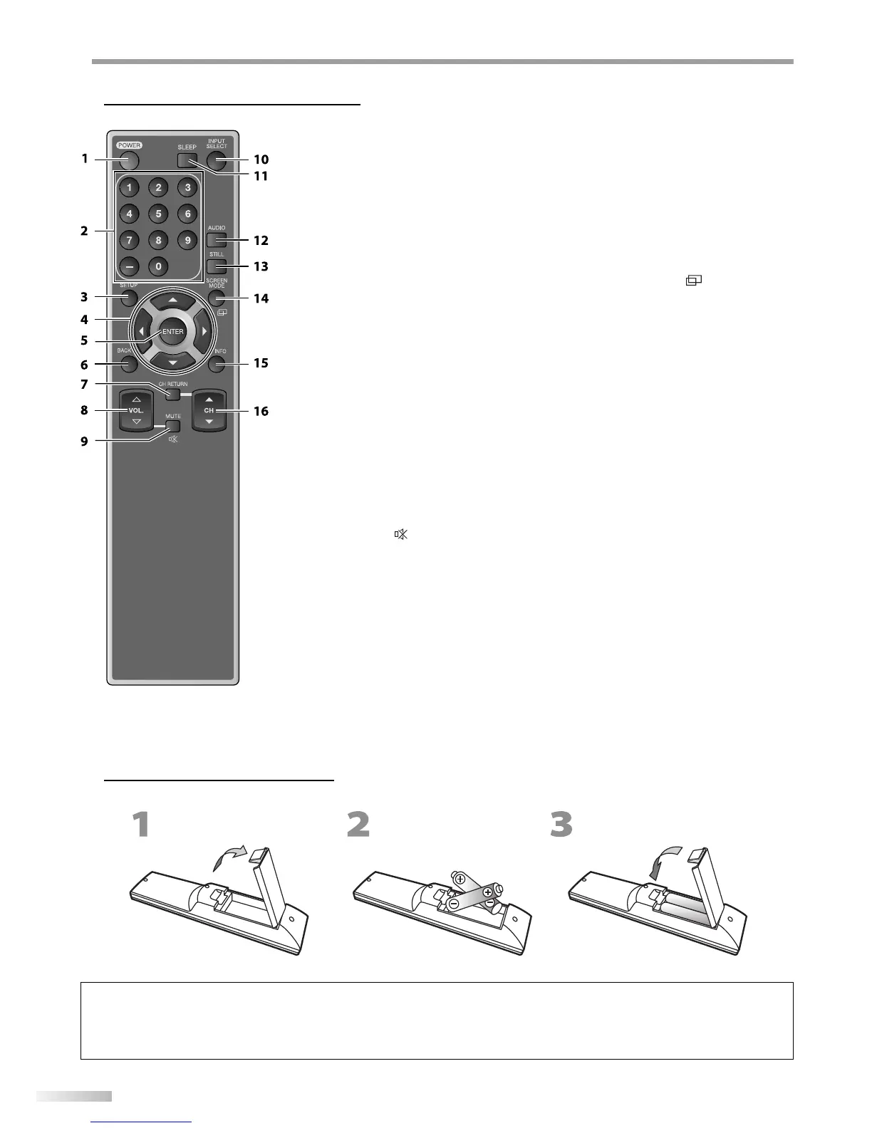 • Be sure to follow the correct polarity as indicated in the battery compartment. Reversed batteries may cause damage to the device.