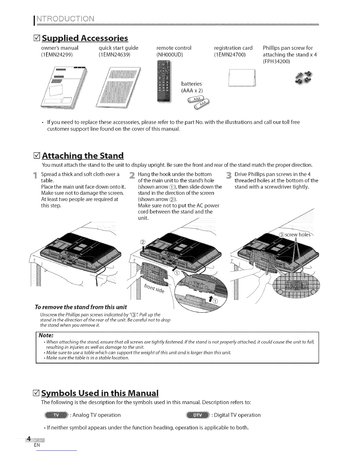 • When attaching the stand, ensure that aft screws are tightly fastened. If the stand is not properly attached, it could cause the unit to fall,