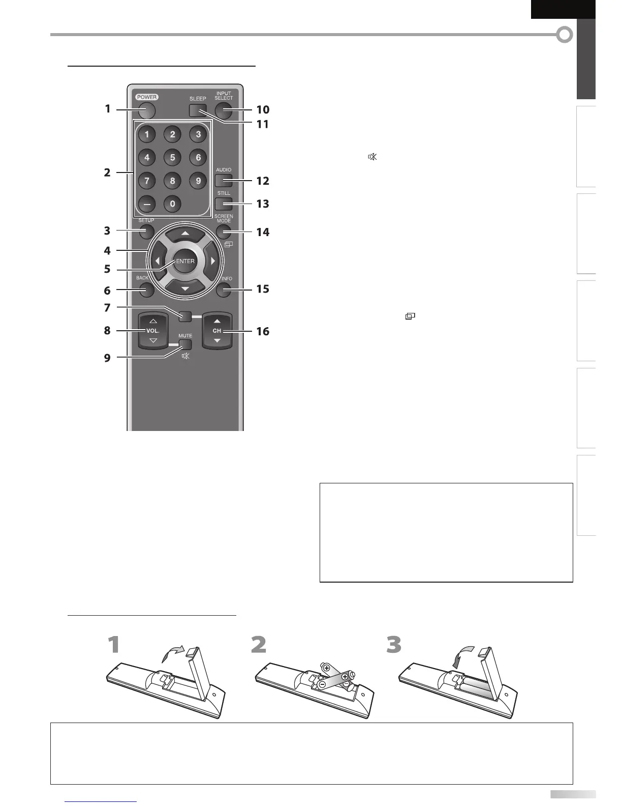 • Be sure to follow the correct polarity as indicated in the battery compartment. Reversed batteries may cause damage to the device.