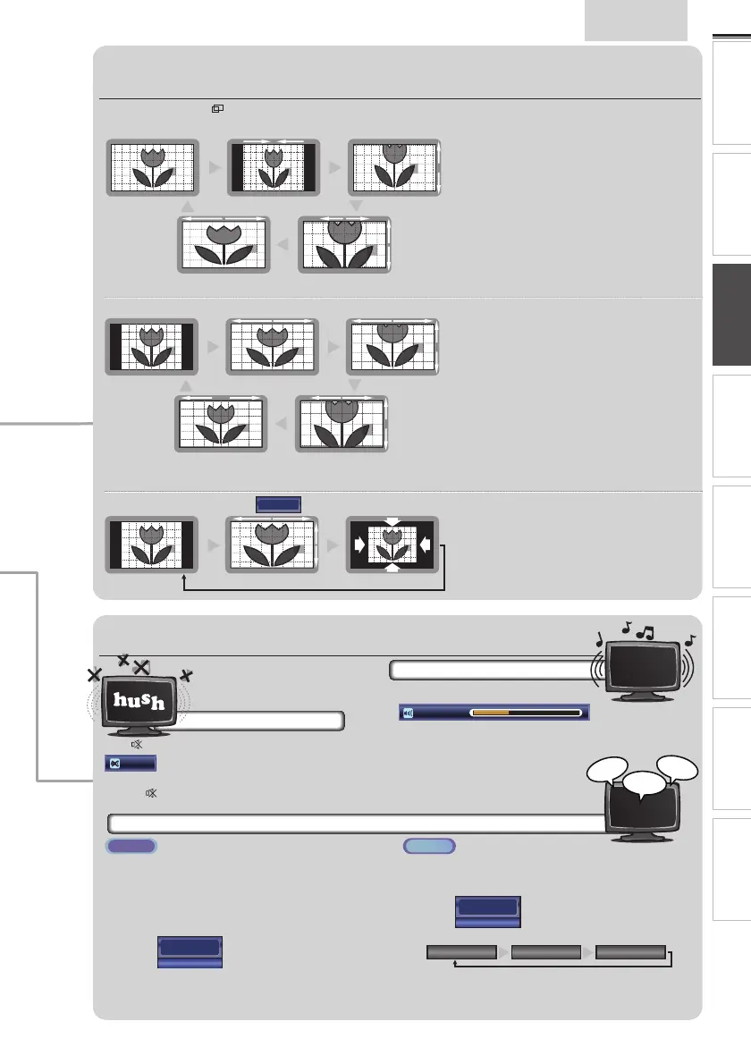 5 types of display modes can be selected when the broadcasting station is sending 16:9 or 4:3 video signal. And 3 types of display
