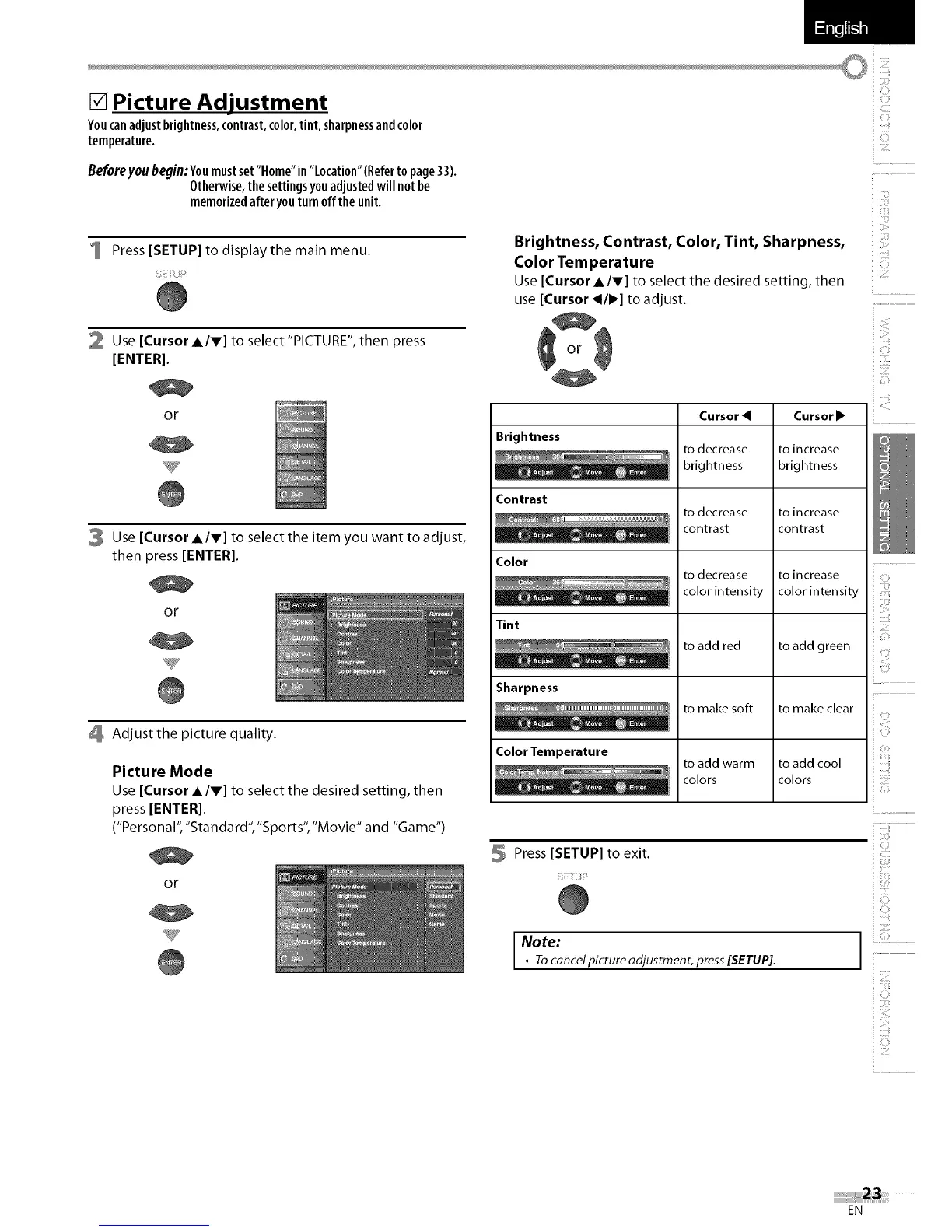• Tocancel picture adjustment, press[SETUP].