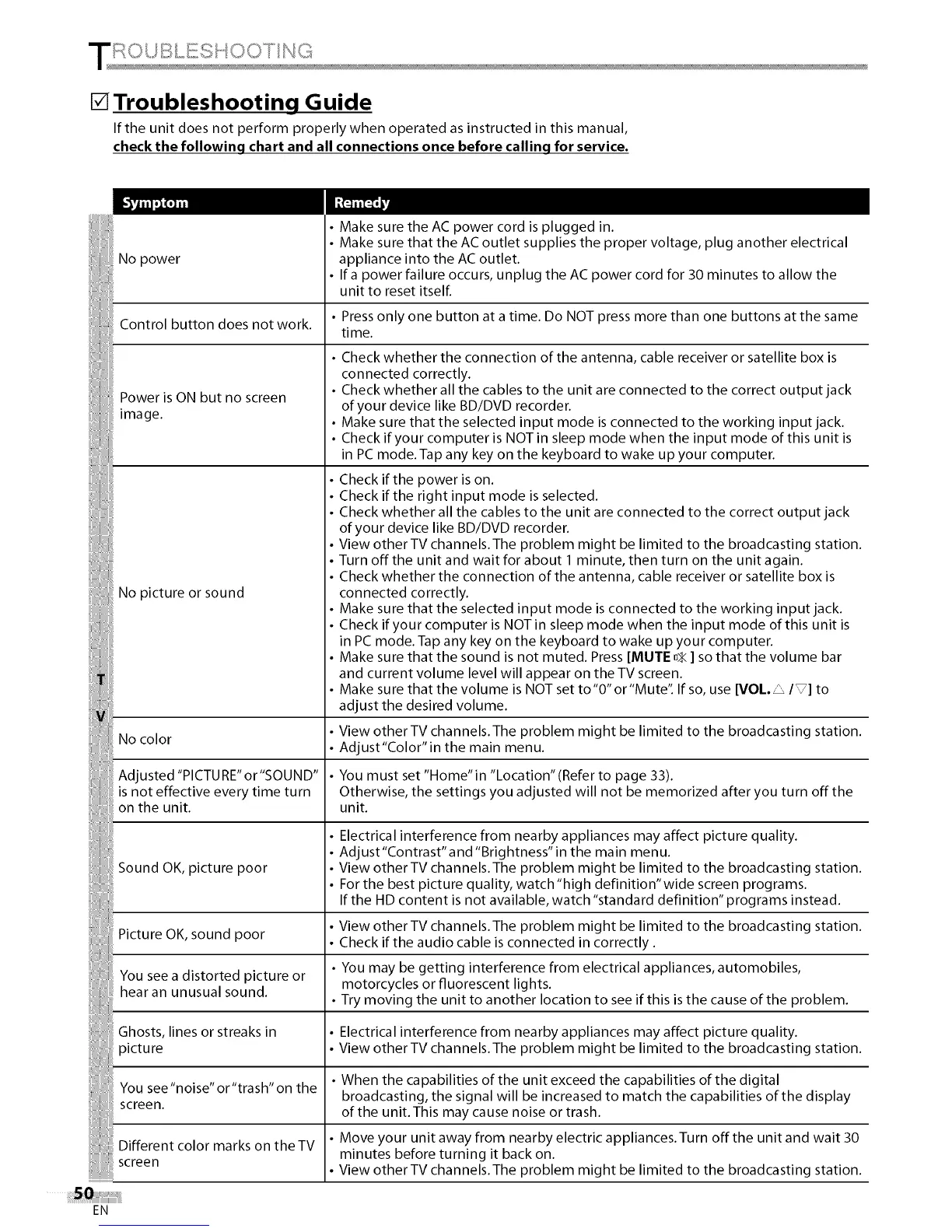 check the following chart and all connections once before calling for service.