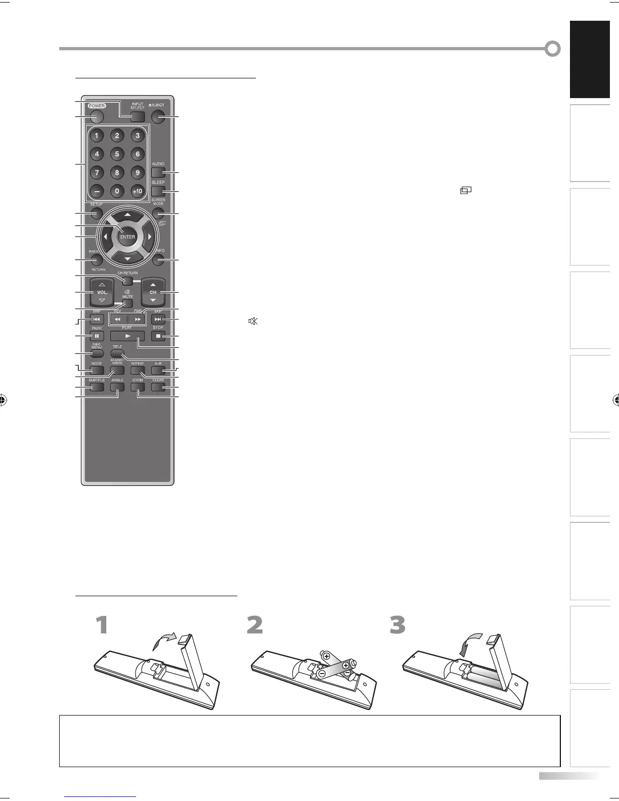 Install the batteries (AA x 2) matching the polarity indicated inside battery compartment of the remote control.
