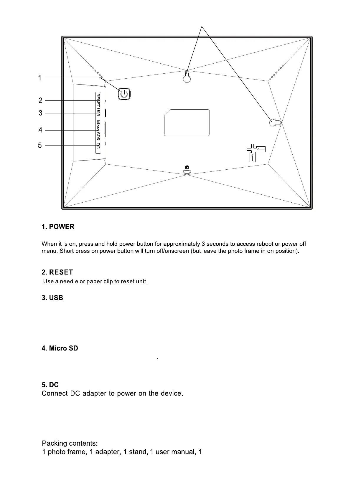 playback photos from USB disk directly. Note: The micro USB port is only for data transfering, not for