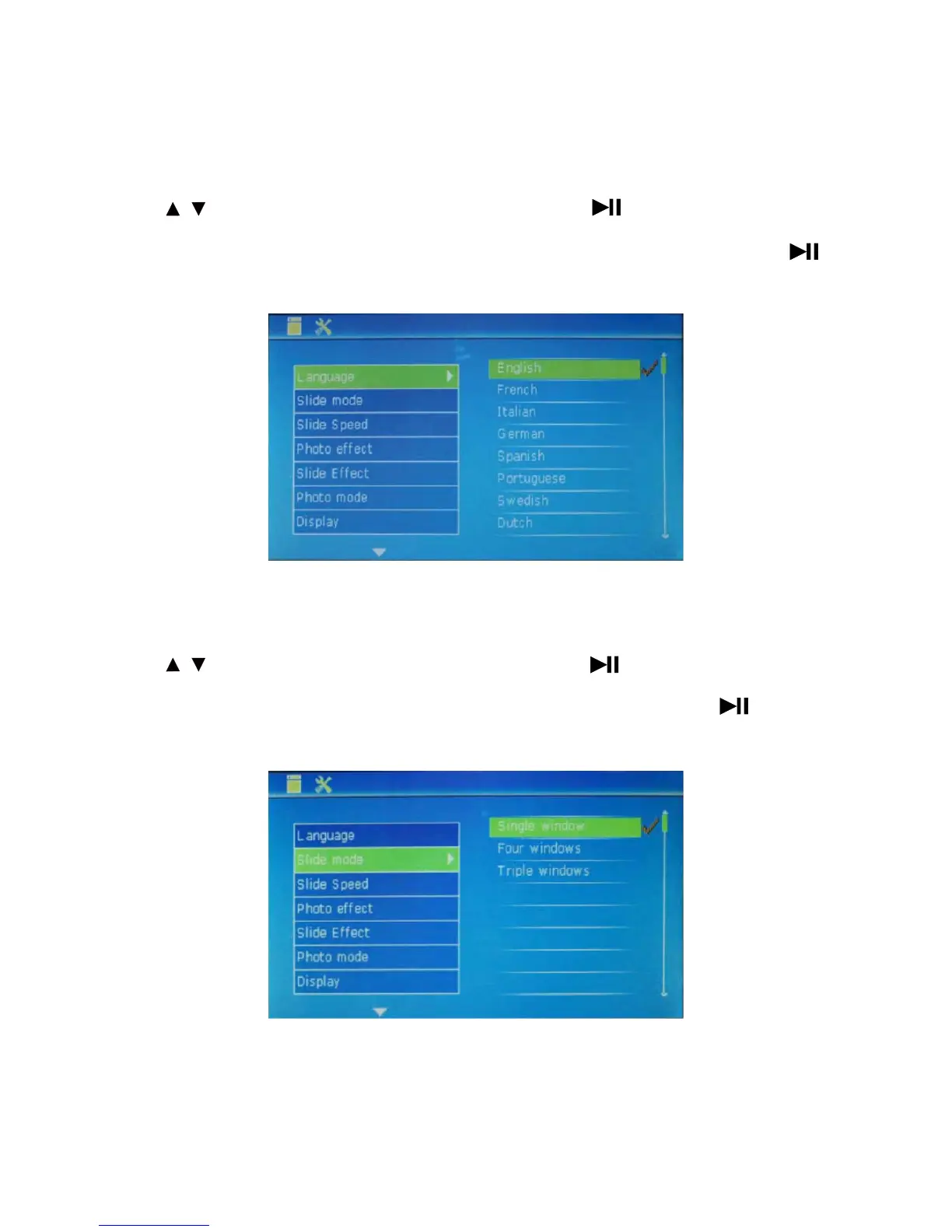 Press to select this option and set the mode of slide play. Press to set sub-items (including