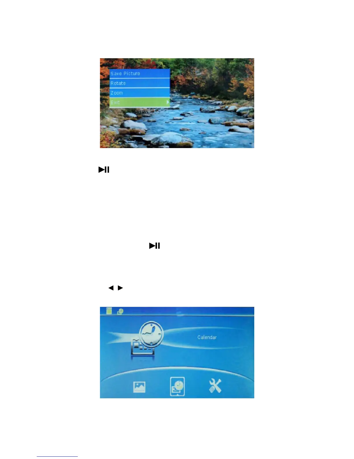 this case, press MENU for 3s , operation as Save Picture, Rotate and Zoom can be carried out to pictures.
