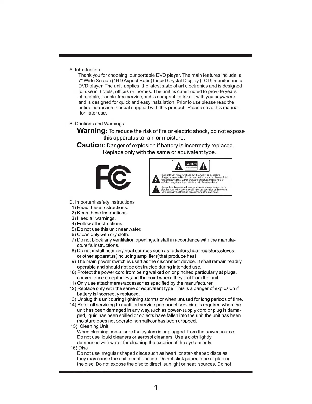 Sylvania SDVD 7014 - Introduction; Cautions and Warnings; Important Safety Instructions