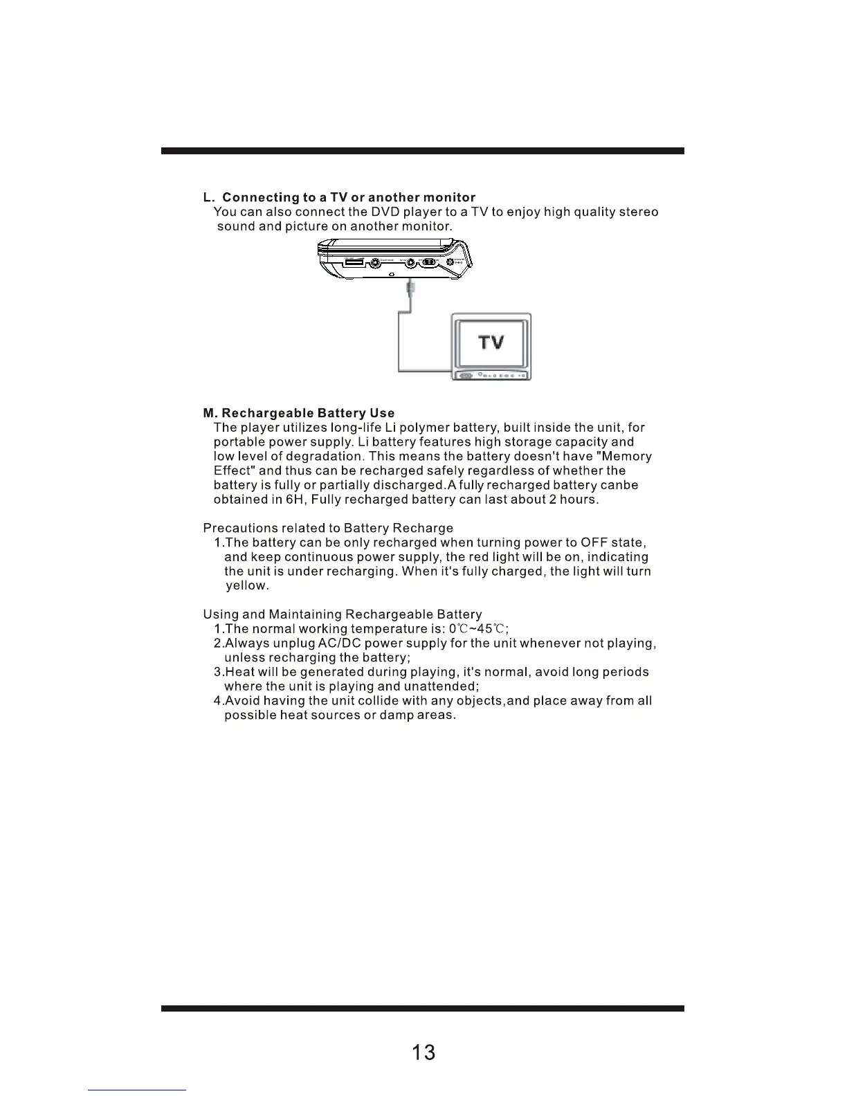 Sylvania SDVD7014 - Connectivity and Battery Management; Connecting to a TV or Monitor; Rechargeable Battery Use and Care