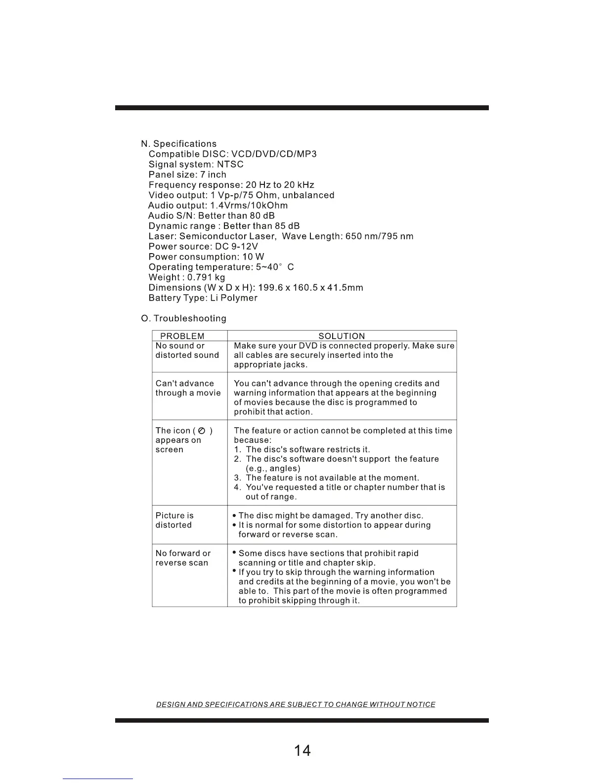 Sylvania SDVD7014 - Specifications and Troubleshooting; Technical Specifications; Troubleshooting Common Issues