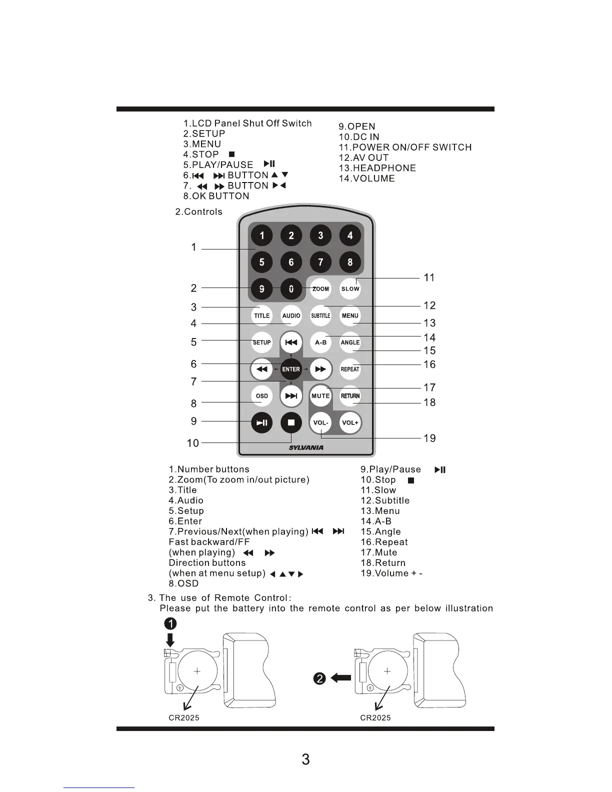 Sylvania SDVD7014 - Remote Control Operation; Remote Control Buttons; Remote Control Battery Installation