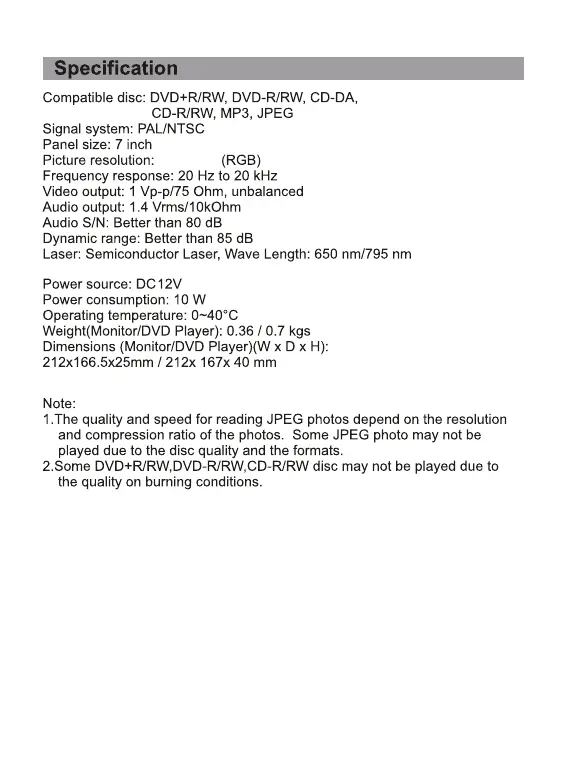 Sylvania SDVD7750 - Specification