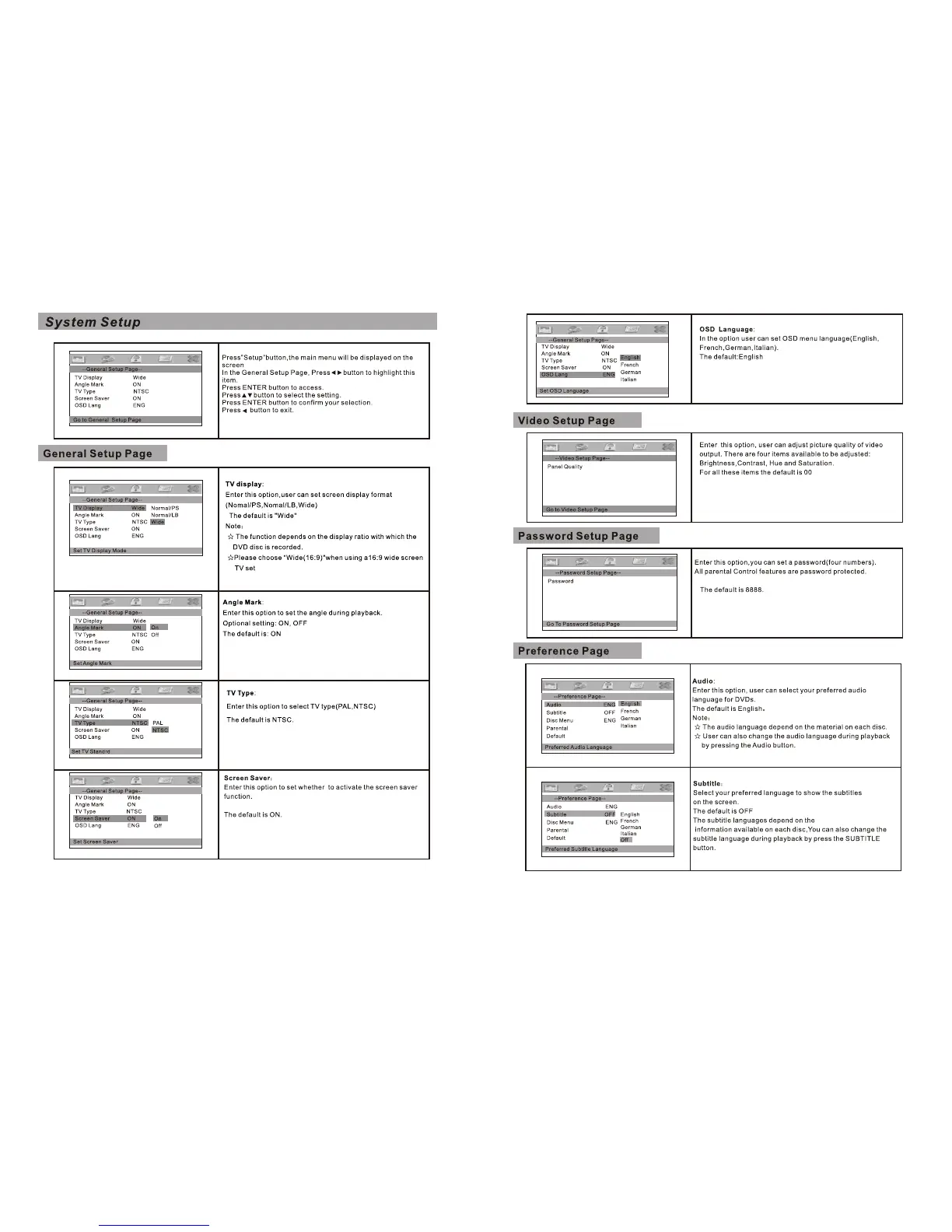 Sylvania SDVD8730 - System Setup; General Setup Page; Video Setup Page; Password Setup Page