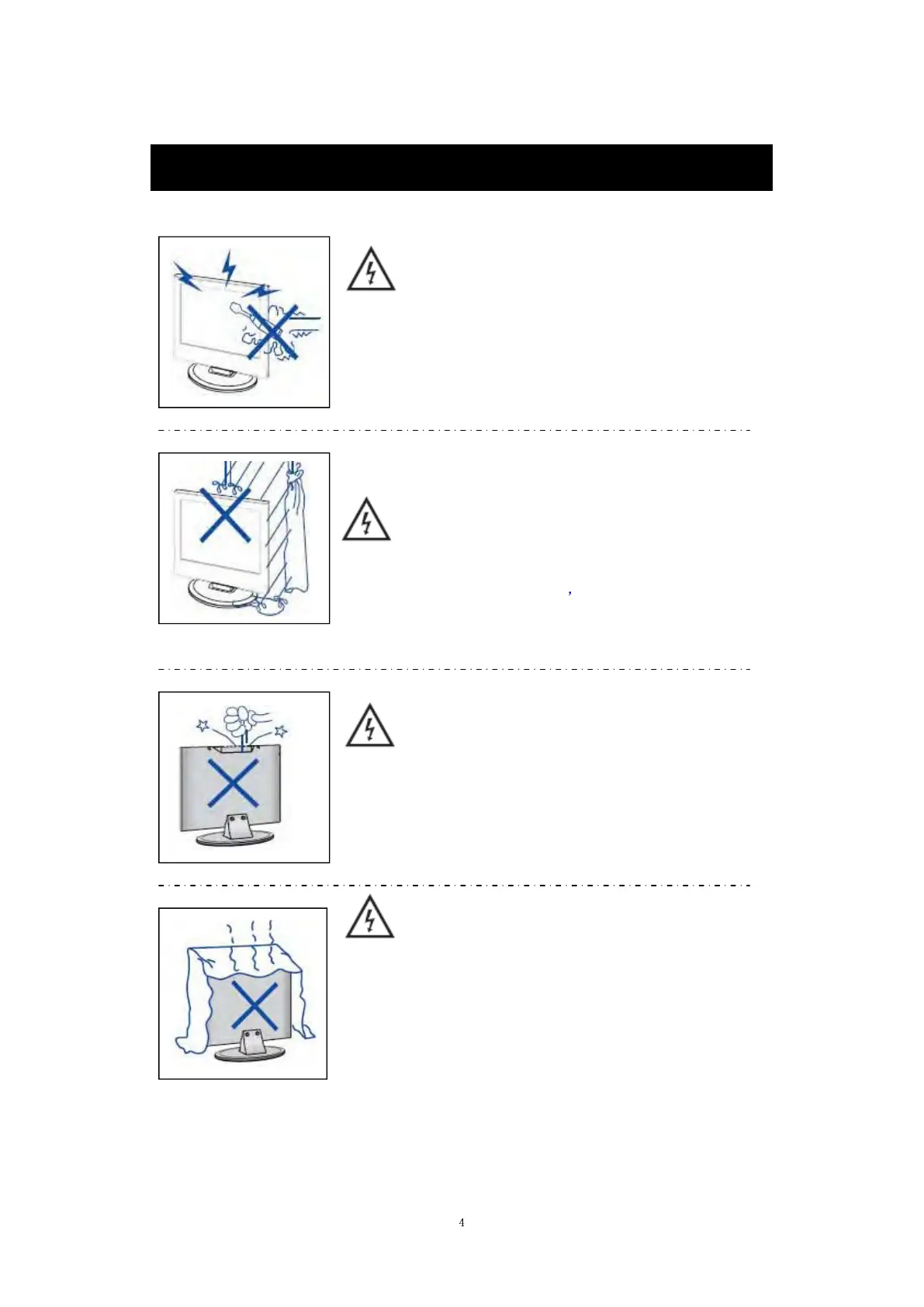slots or openings. Never spill any kind of liquid on the