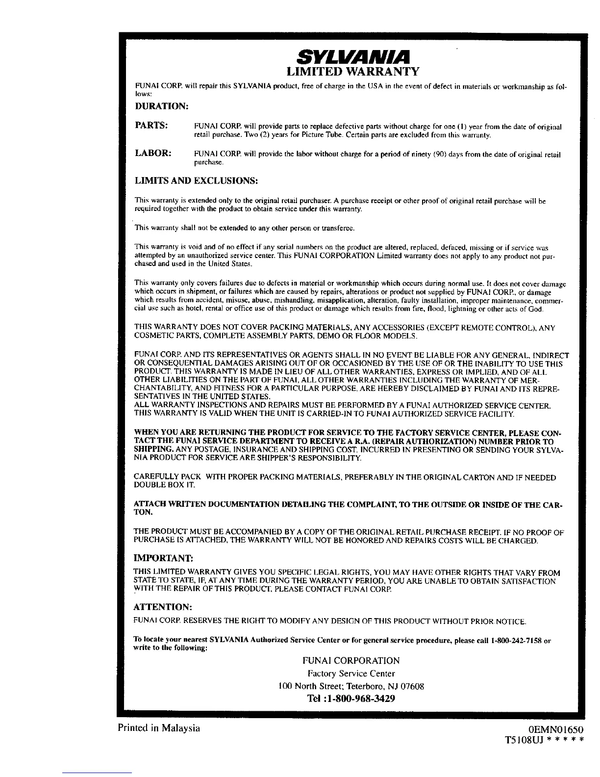 EUNAI CORP. will repair this SYLVANIA product, free of charge in the USA in the event of defect in materials or workmanship as fol-