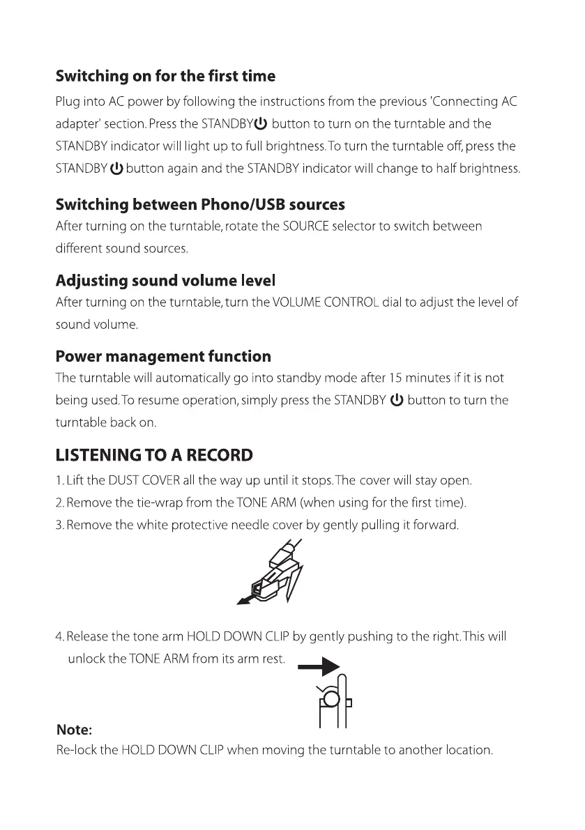 Sylvania SRC831 - Switching on for the first time; Switching between Phono;USB sources; Adjusting sound volume level; Power management function