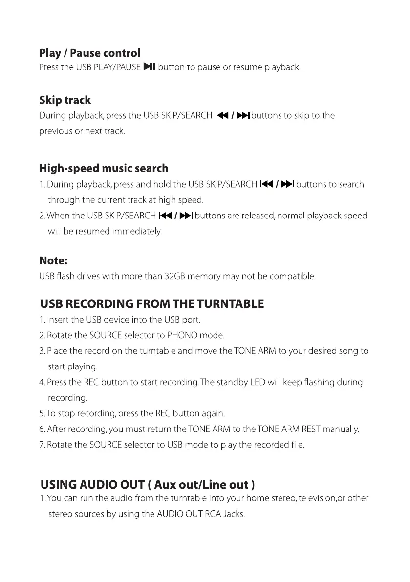 Sylvania SRC831 - Play; Pause control; Skip track; High-speed music search; USB RECORDING FROM THE TURNTABLE