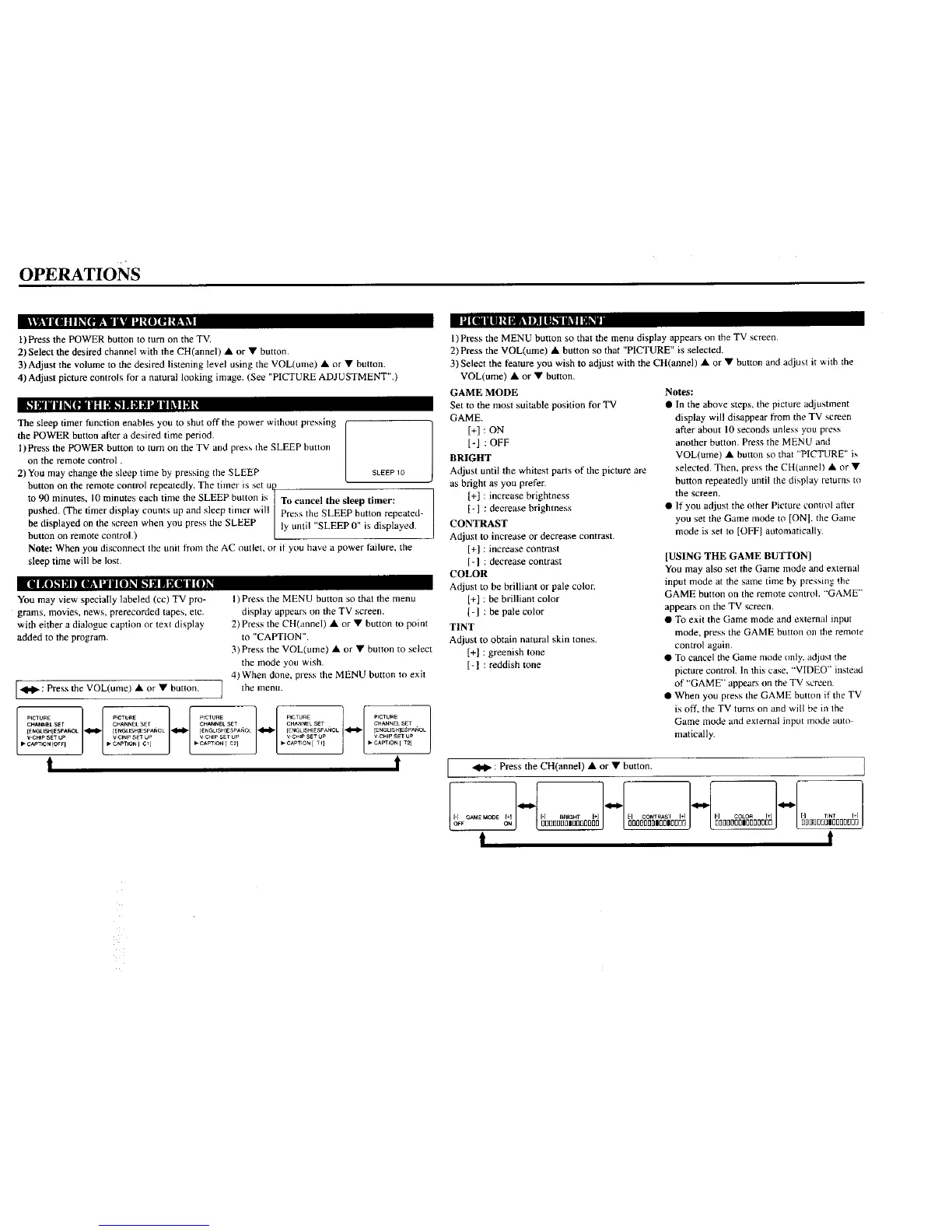 3)Select the feature you wish to adjust with the CH(annel) • or • button and adjust it with the