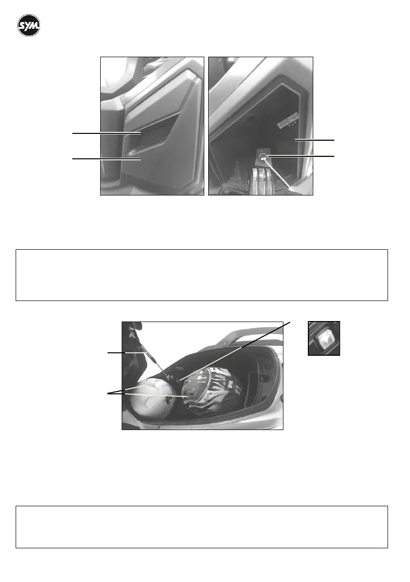 The luggage box is under the seat. Open the seat (page 12) to use the luggage box. Helmets ○A can be