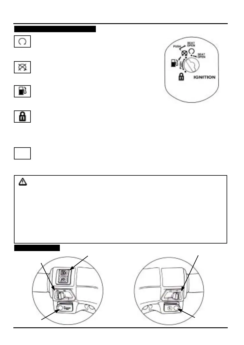 y Never turn the ignition switch key when the scooter is running. Turning the key to either “OFF”
