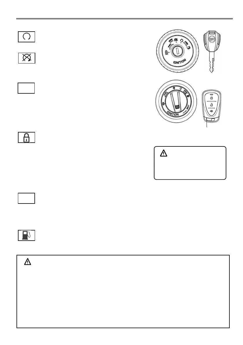Never operate the ignition switch key when the motorcycle is running. To turn the ignition switch to