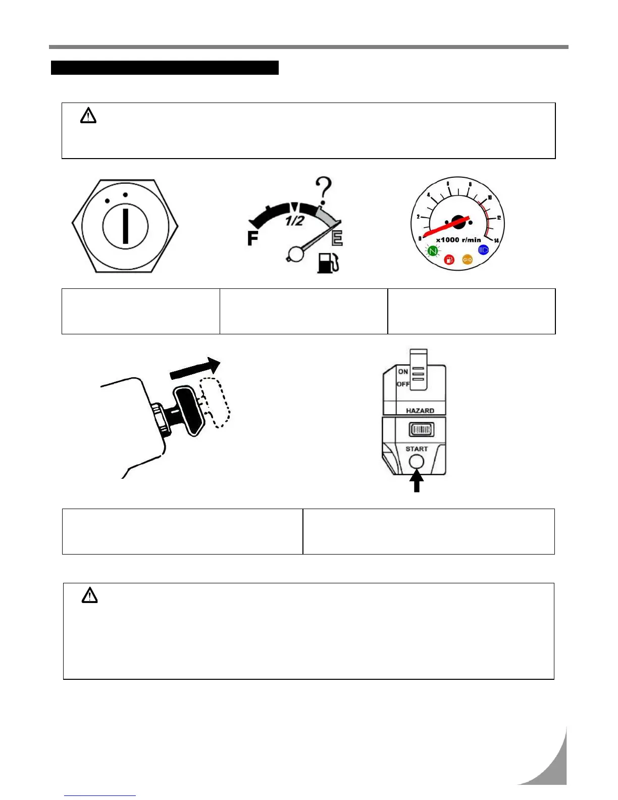 ! Please check the oil and fuel volume before starting the engine. Start the engine in a ventilative