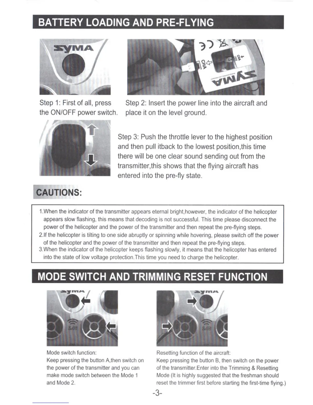 SYMA X3 - BATTERY LOADING AND PRE-FLYING; CAUTIONS; MODE SWITCH AND TRIMMING RESET FUNCTION