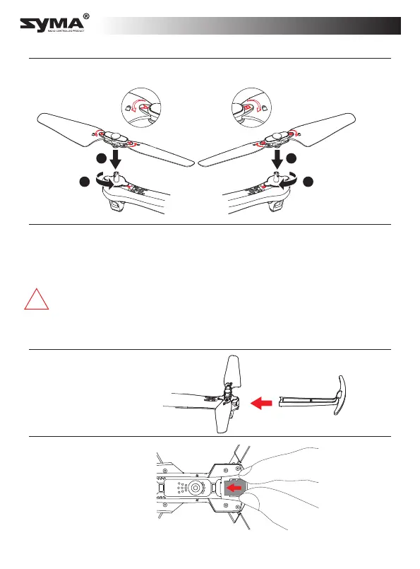* Attach the propellers as shown in the diagrams above. Ensure that they are