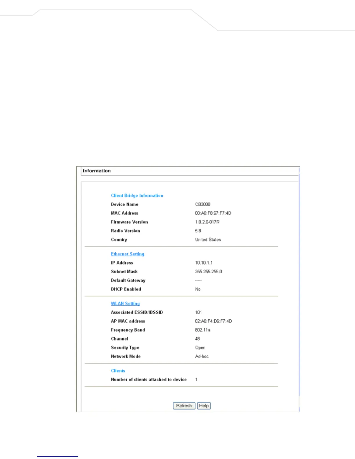 • Client Bridge Information – Includes the factory settings such as device name, MAC address,