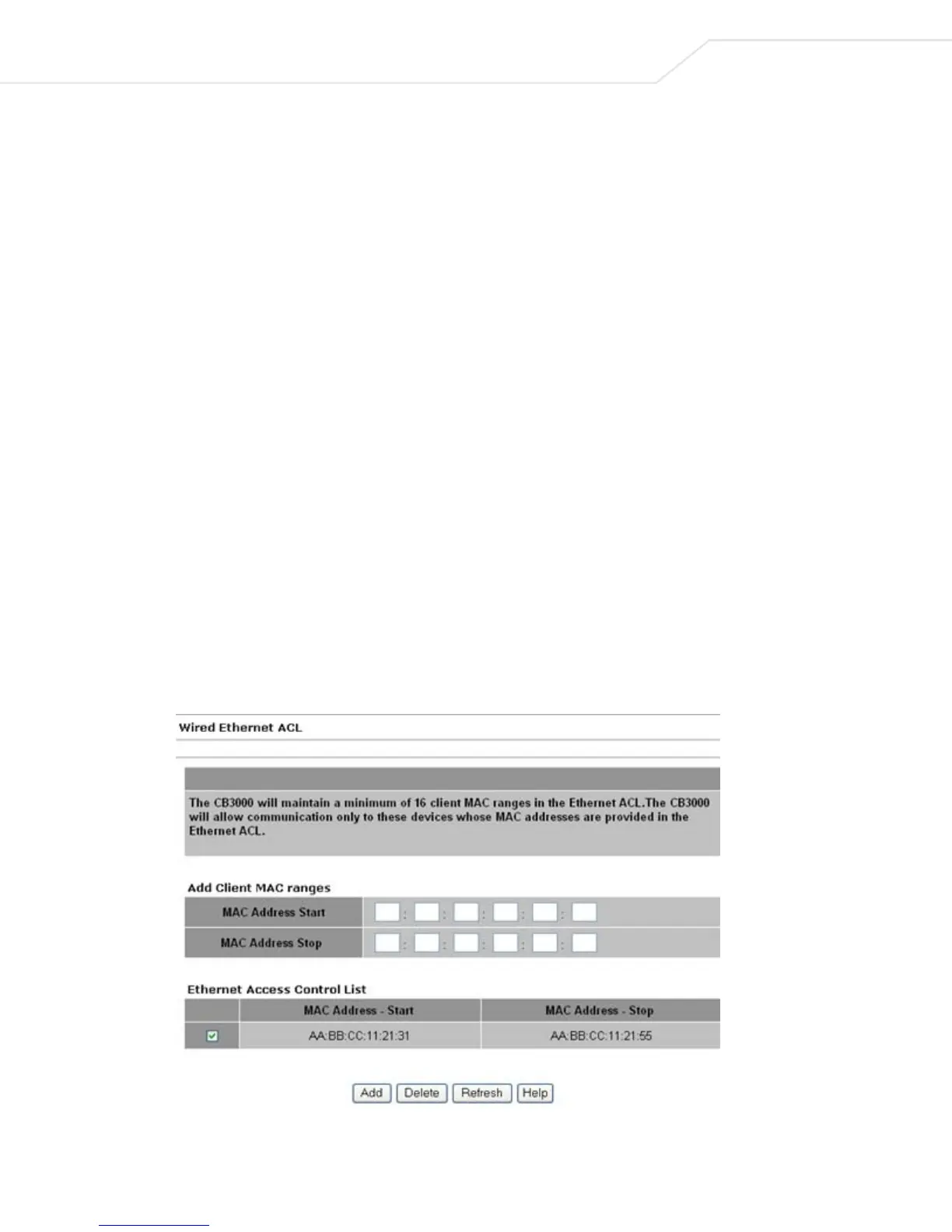 The CB3000 supports Ethernet MAC filtering. Only client devices with a MAC address within the range