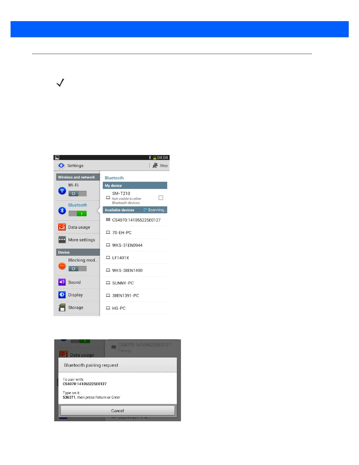 4. Tap Bluetooth. If Bluetooth is not enabled, swipe to enable it. The CS4070 appears in the Available devices
