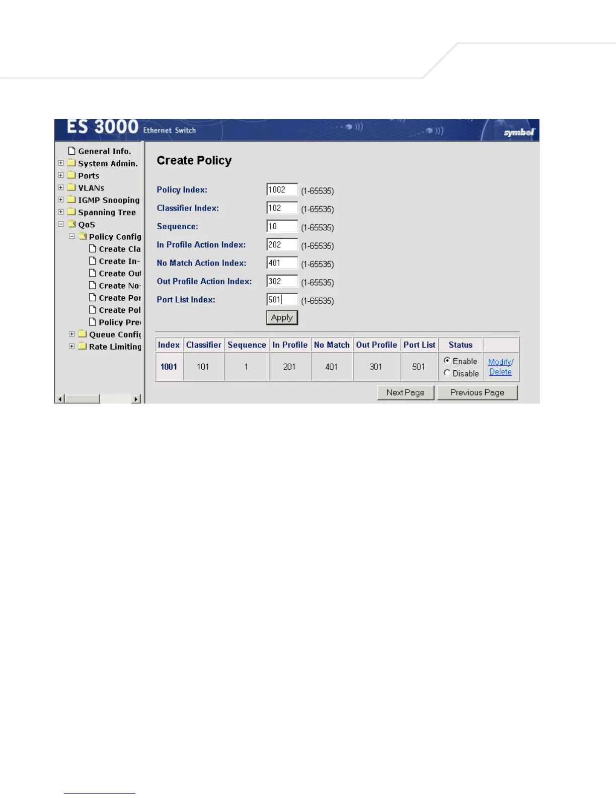 using the Policy Precedence display in the web interface (QoS > Policy Config. > Policy Precedence),