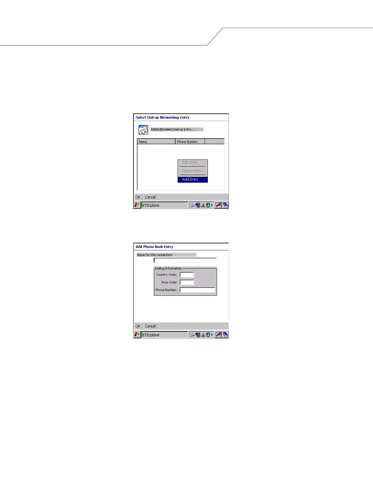 1. In the Select Dial-up Networking Entry window, tap and hold and then select Add Entry from the pop-up menu.