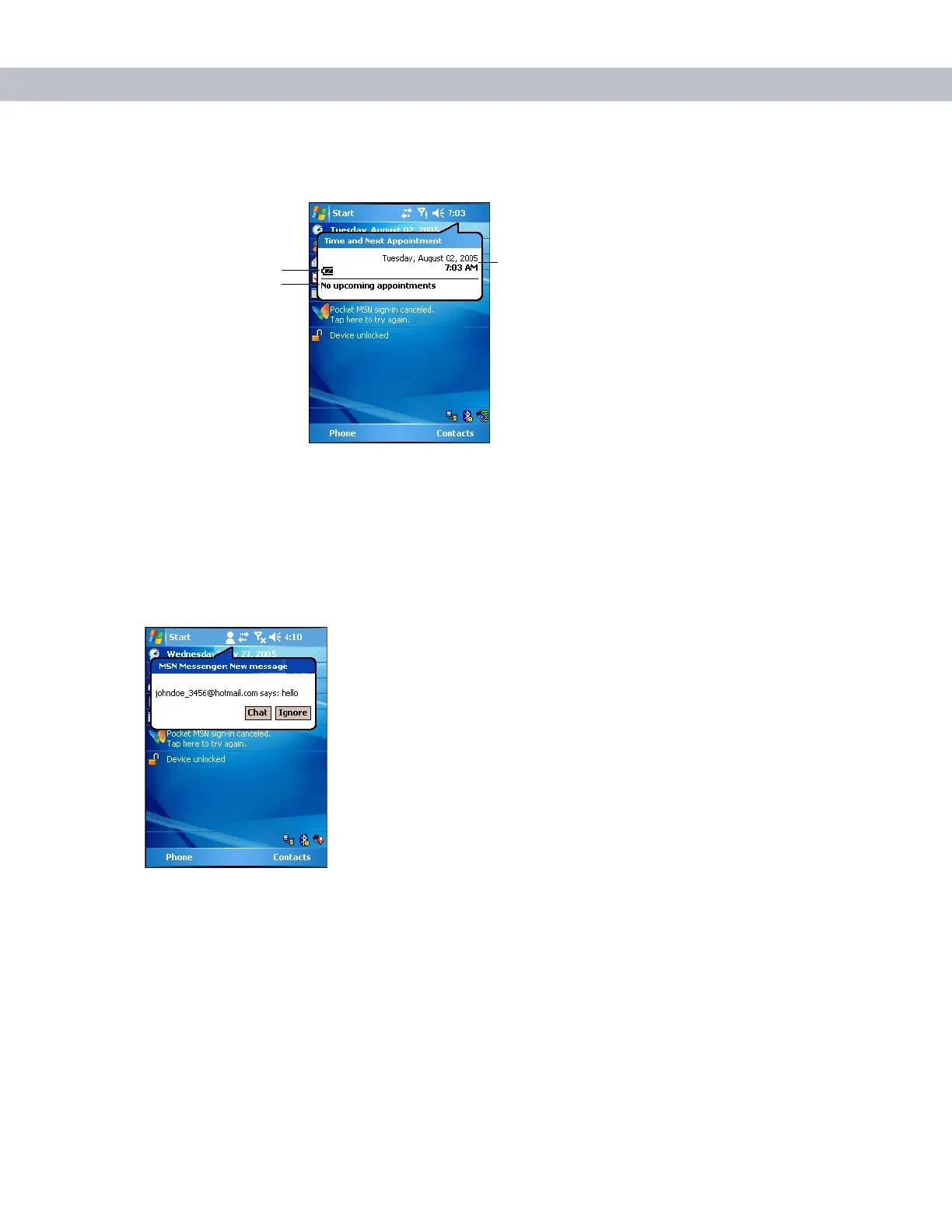 The dialog box displays the current date and time, the battery status, and any upcoming appointments in the