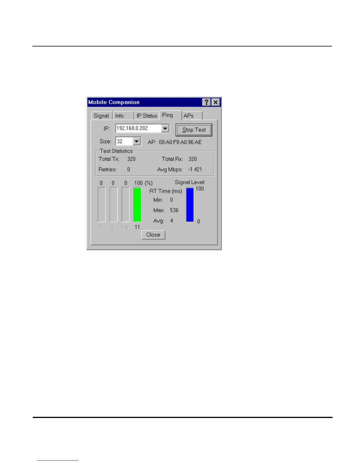 ping test. The average mega-bits per second, signal strength, data rate