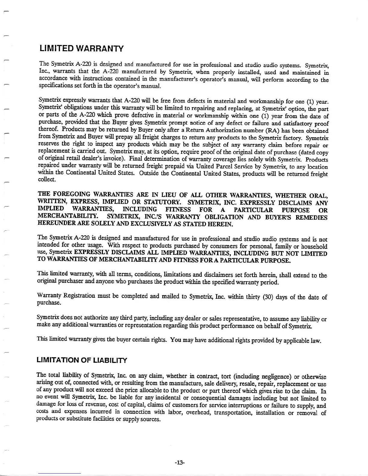 Symetrix A-220 - LIMITED WARRANTY; LIMITATION OF LIABILITY