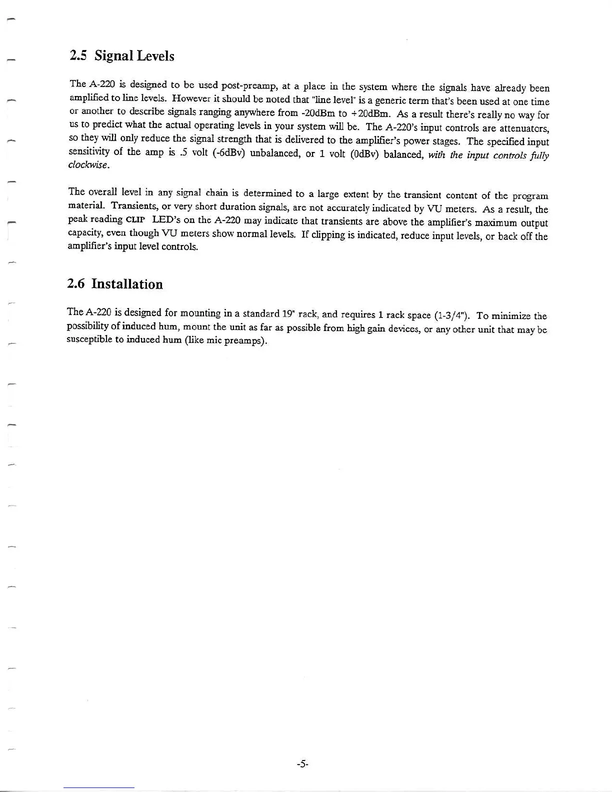 Symetrix A-220 - 2.5 Signal Levels; 2.6 Installation