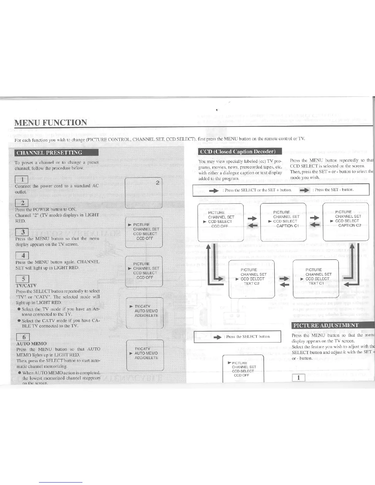 Symphonic ST131E - NAVIGATING THE TV MENU SYSTEM; CHANNEL PRESETTING AND AUTO MEMO; TV;CATV MODE AND CLOSED CAPTION SELECTION; PICTURE ADJUSTMENT MENU OPTIONS