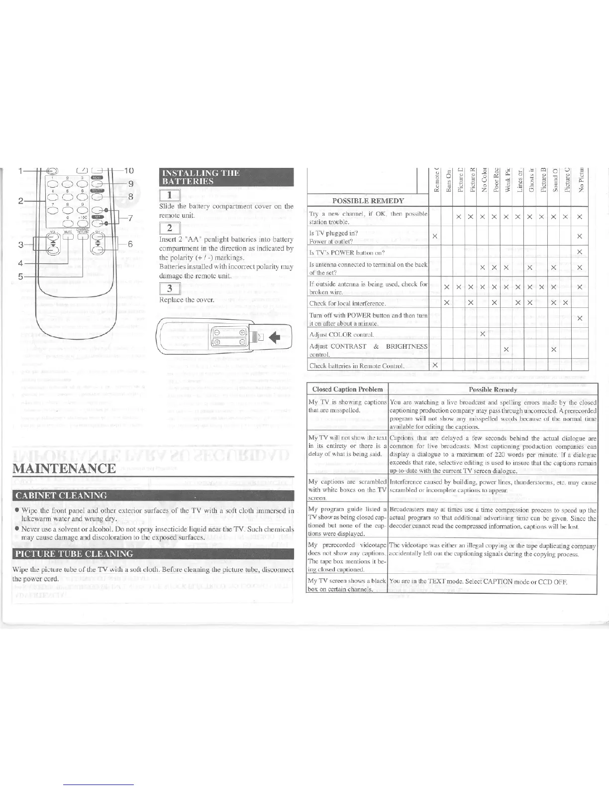 Symphonic ST131E - REMOTE CONTROL MAINTENANCE; BATTERY INSTALLATION PROCEDURE; TV CLEANING AND MAINTENANCE; CABINET AND PICTURE TUBE CLEANING