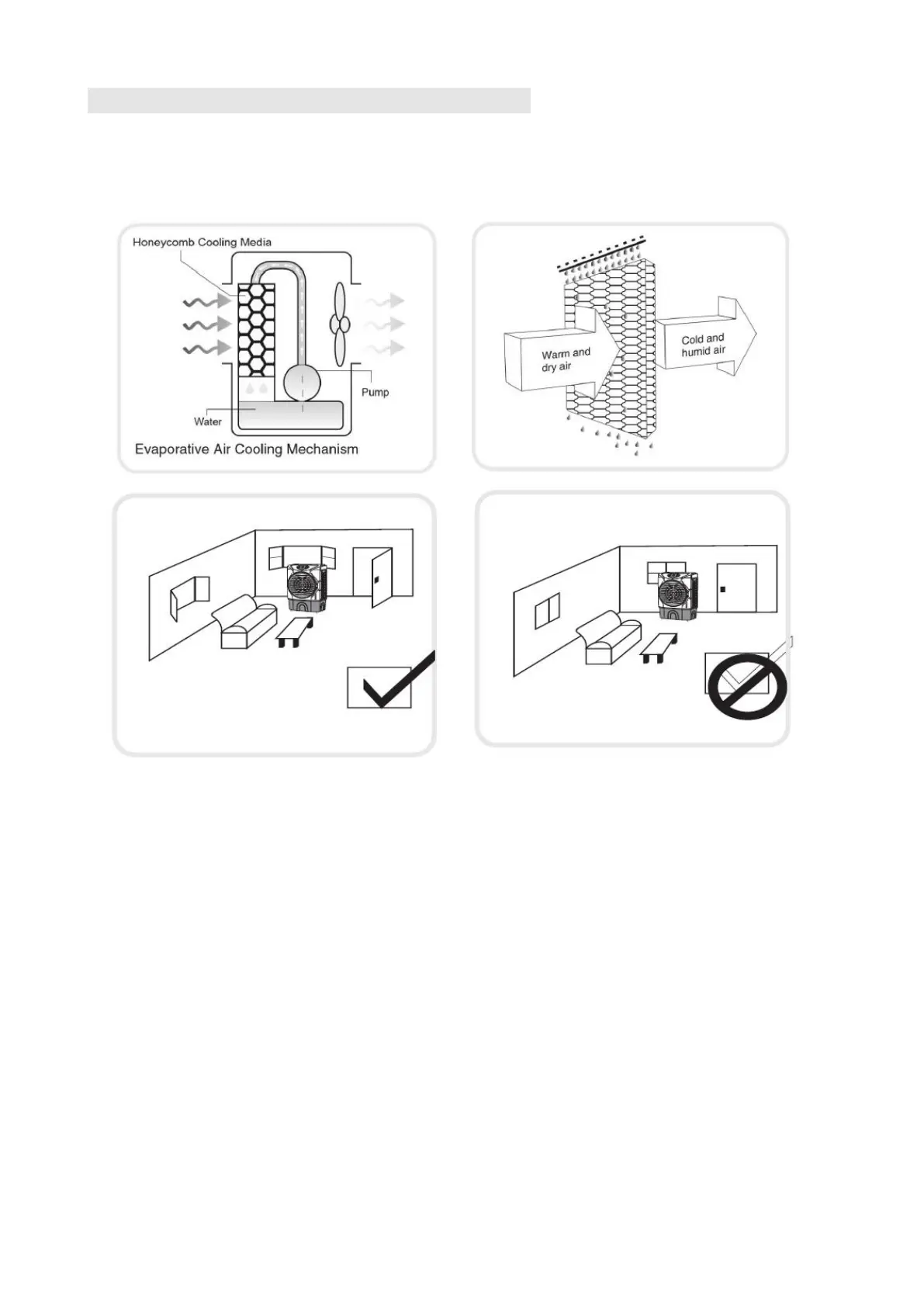 • The evaporative air cooler should not be used in enclosed or sealed spaces. It must be kept
