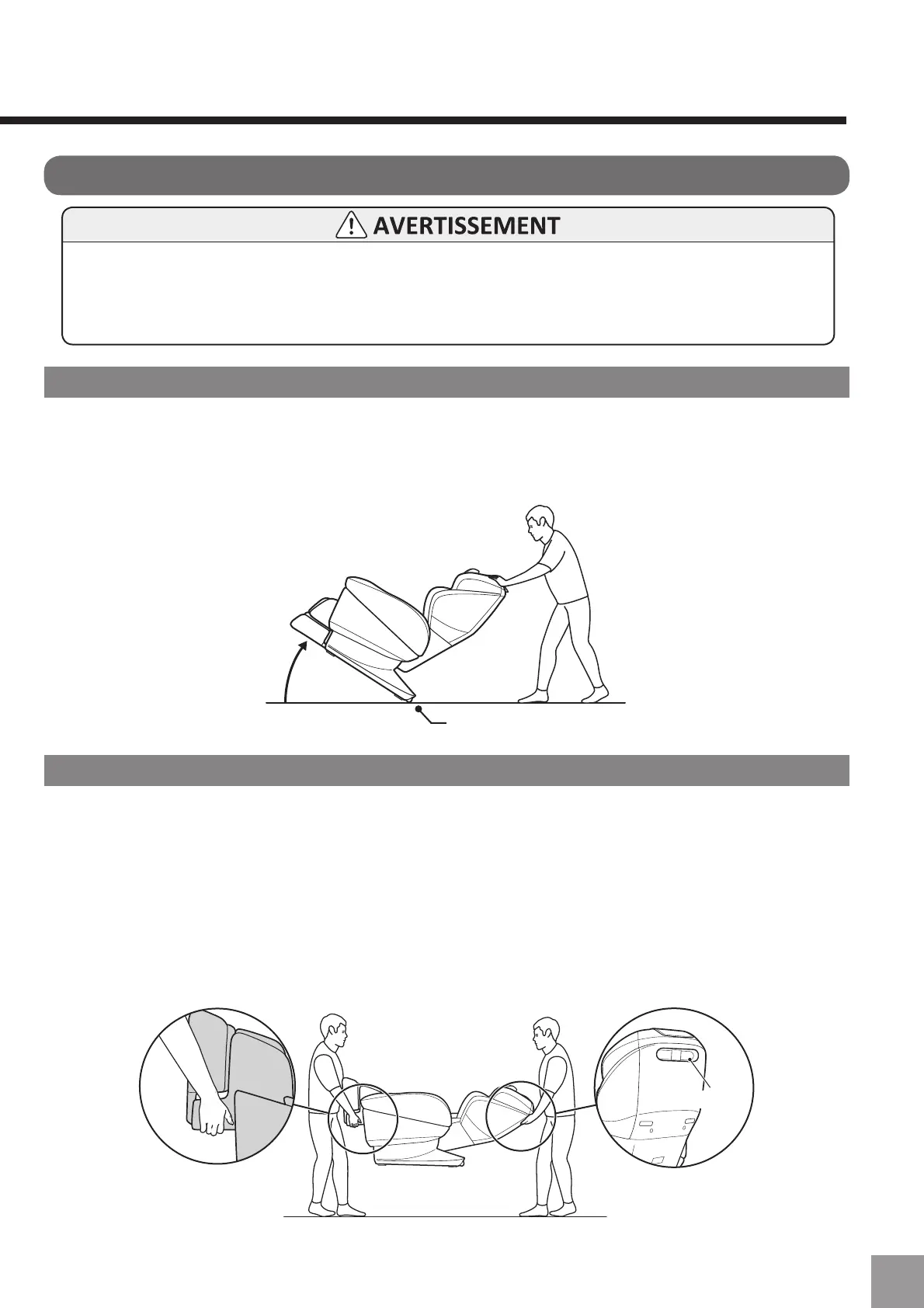 Ne déplacez pas le fauteuil lorsque des personnes ou des objets sont dessus. Risque d'accident ou de blessure.