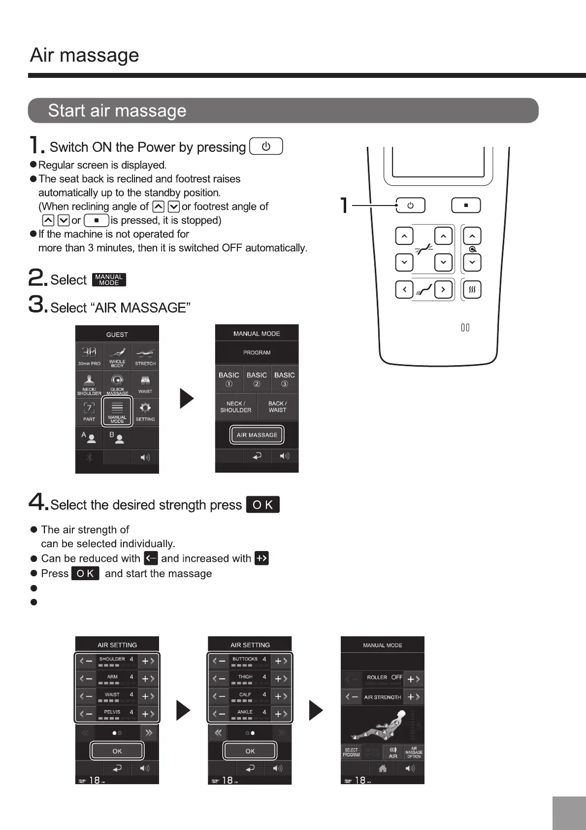 Turn the foot air and foot roller 「off」 and lower the footrest when you want to lower the footrest to