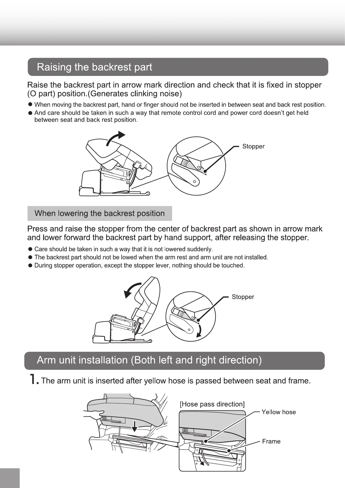 Synca Kurodo - Setup and Assembling; Raising the Backrest Part; When Lowering the Backrest Position; Arm Unit Installation (Both Left and Right Direction)