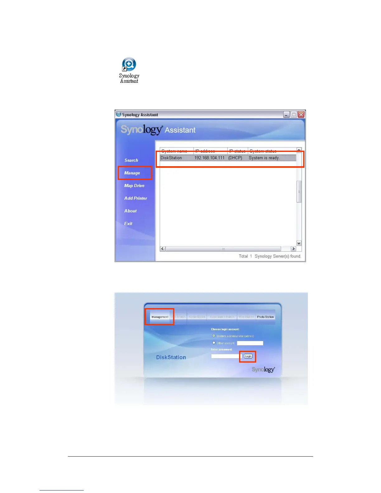 6. Click on “Management”. Choose “login as system administrator (admin)”,