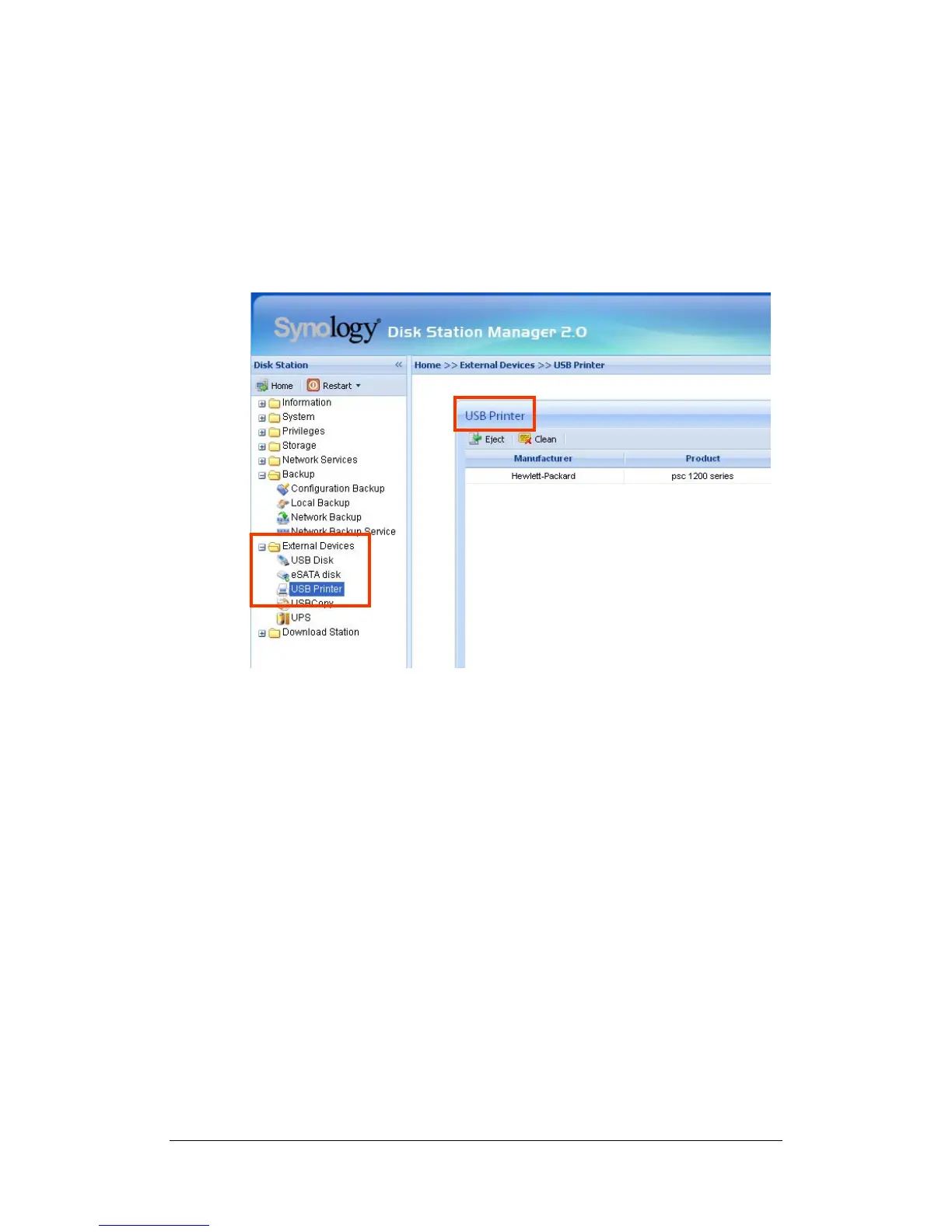 the “External Devices > USB Printer” page of the Web Management UI for the