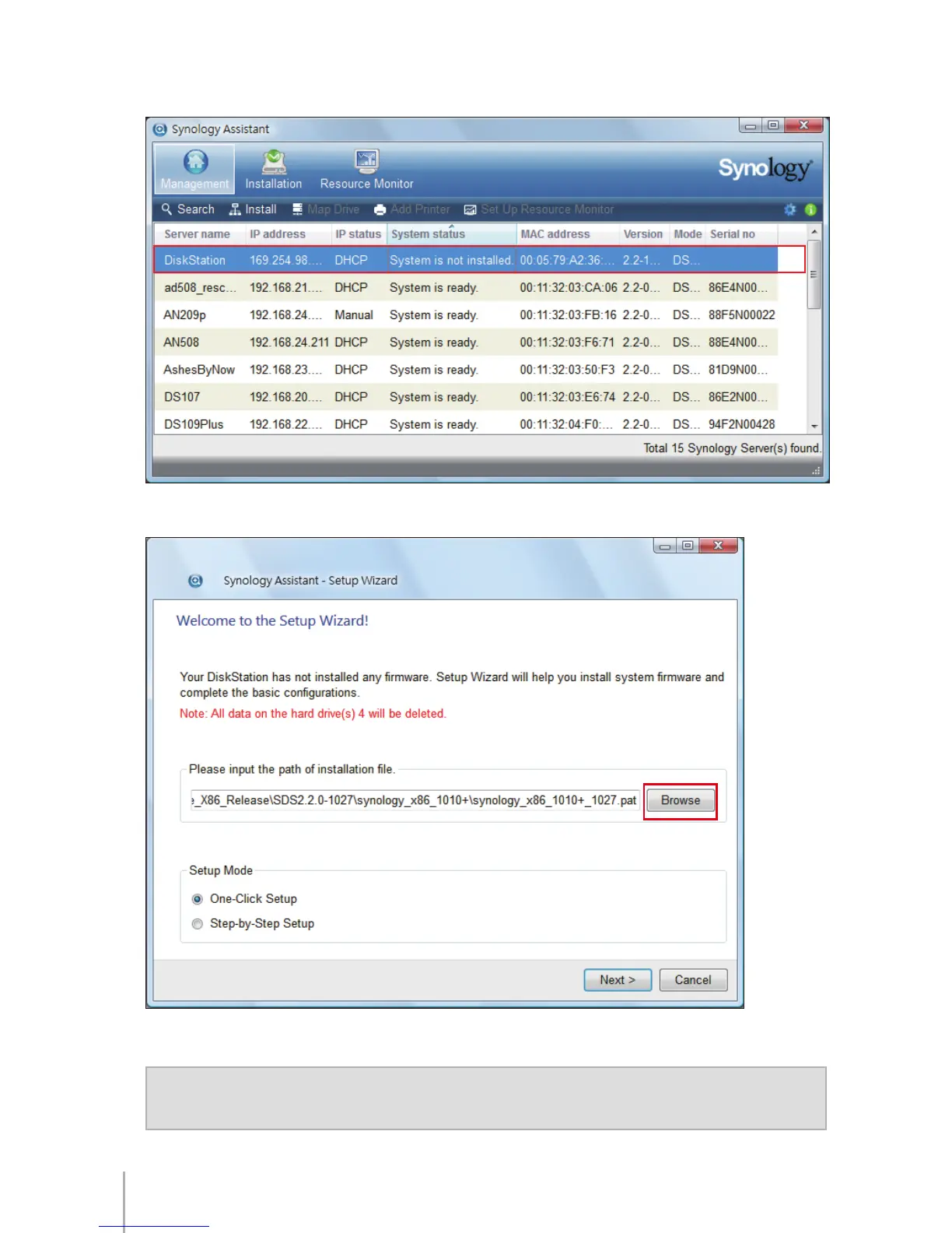 Note: If you choose One-Click Setup, the default admin password for your Disk Station