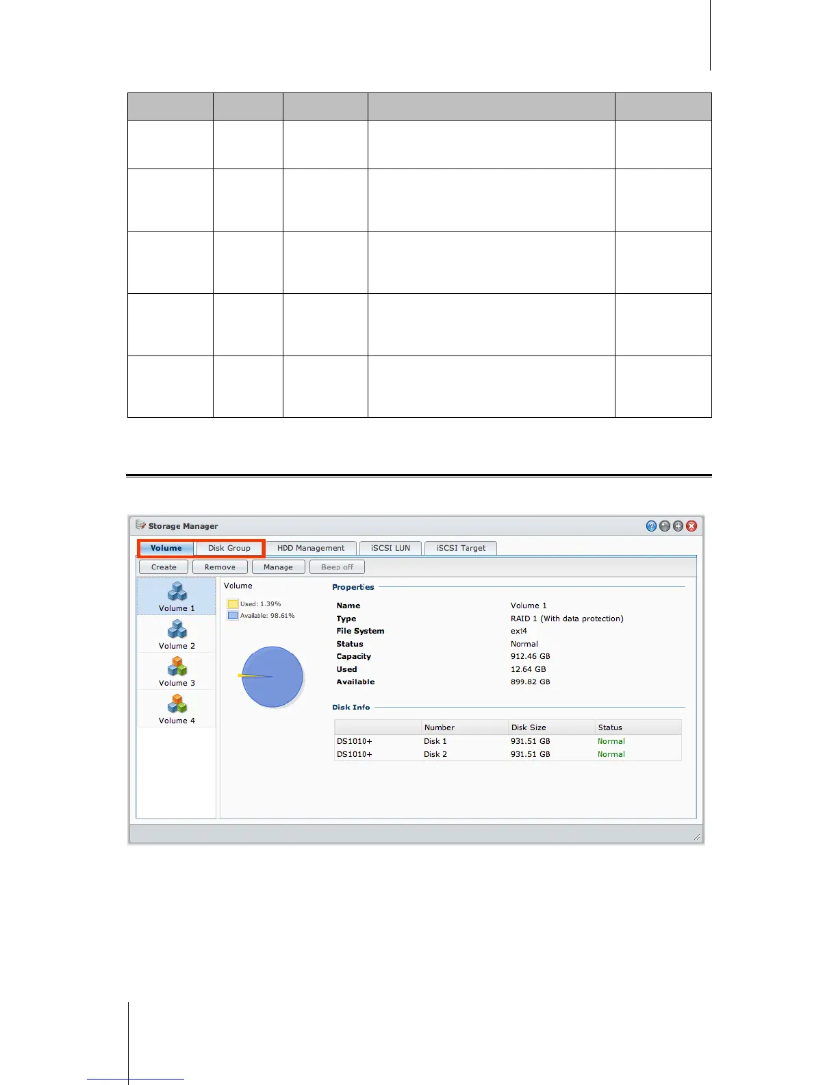 Go to Main Menu > Storage Manager and click the Volume or Disk Group tab to create, set up, and manage