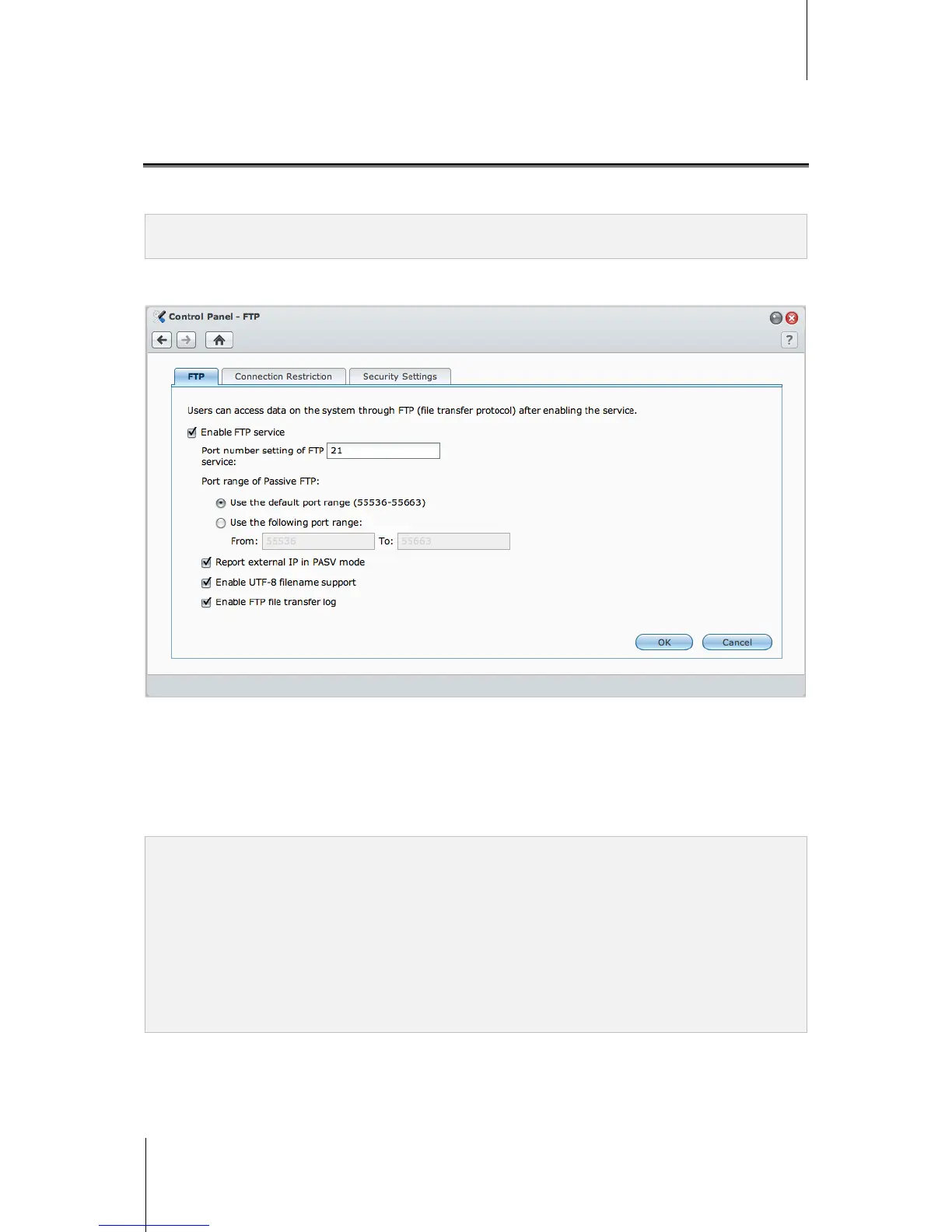 Go to Main Menu > Control Panel > FTP to enable FTP service, allowing users to upload or download