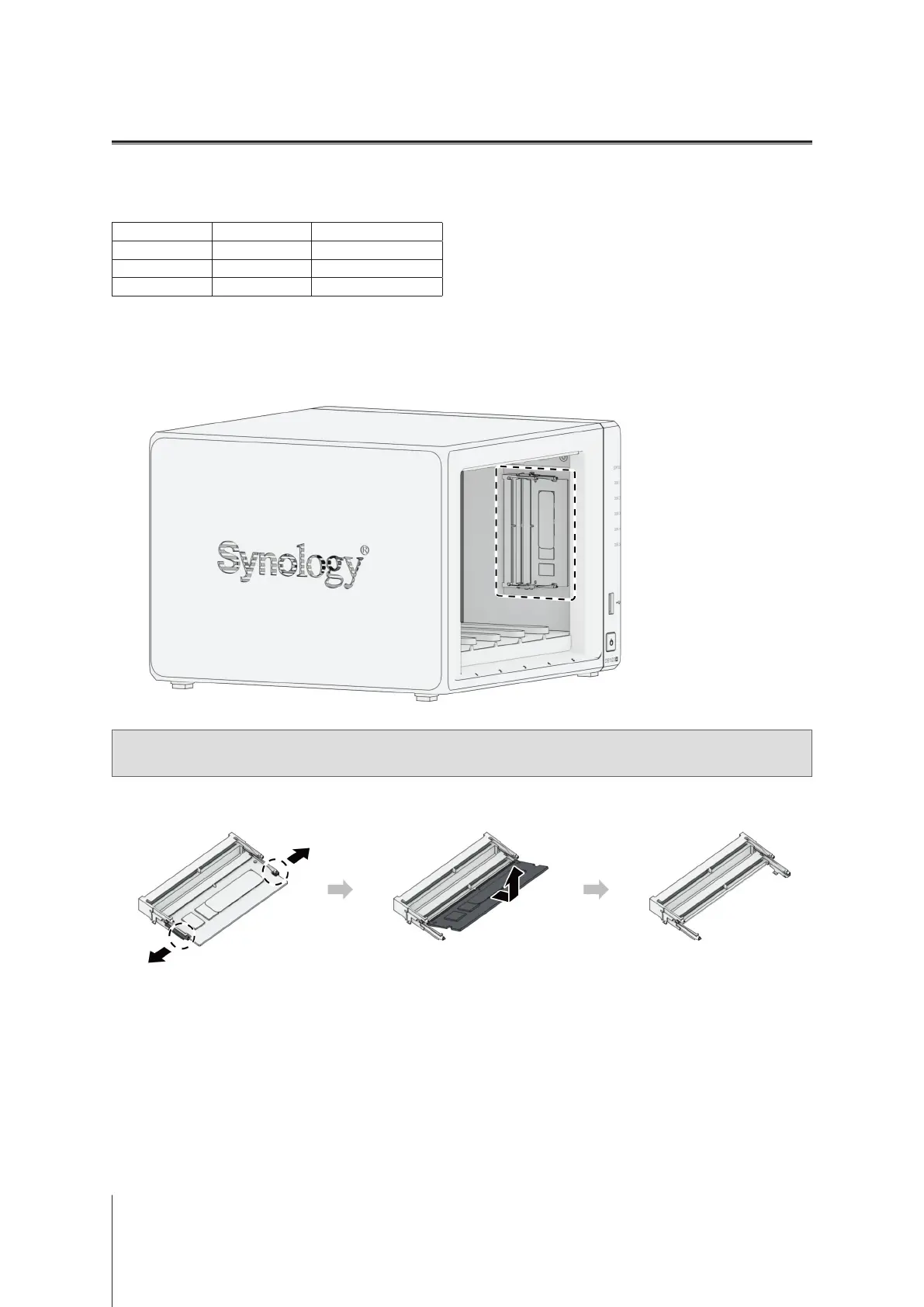 below to install, check, or remove a memory module on your Synology NAS.