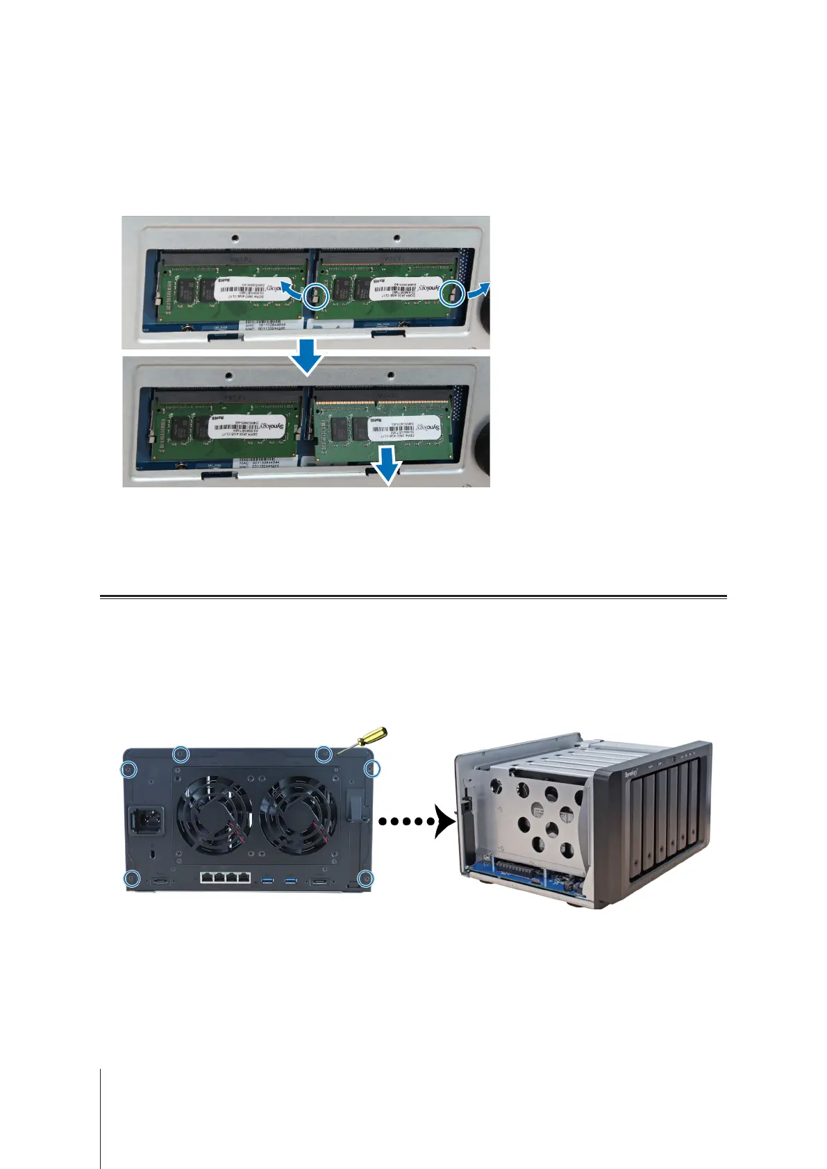 Follow step 1 to 3 of the "To install the RAM module" section to shut down your DiskStation, disconnect the