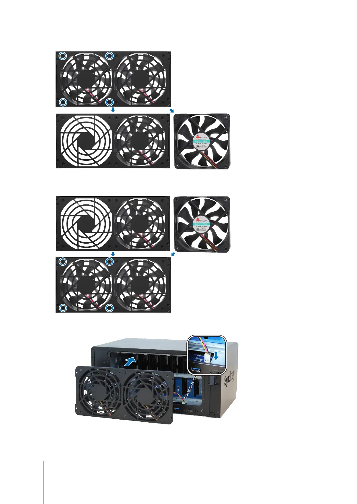 Replace the malfunctioning fan with a good one (with the fan cable within the fan pointing at the bottom-right